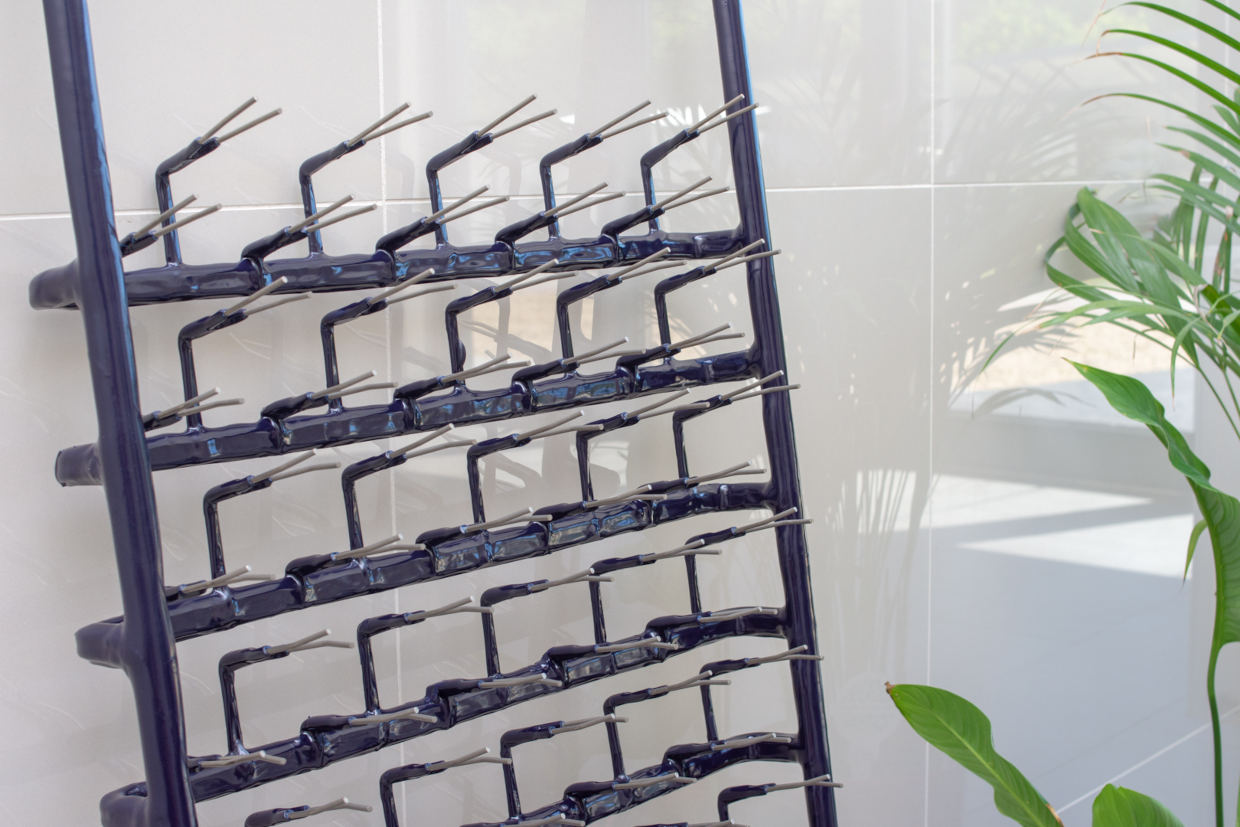 Staramy się, by powierzchnia projektowanej zawieszki była zawsze maksymalnie wykorzystana dla zadanej ilości wsadu na danej linii galwanicznej. Zawieszki wykonujemy z takich materiałów jak stal kwasoodporna, stal konstrukcyjna, mosiądz, miedź, aluminium, tytan. Na haczyki bądź elementy mocujące stosujemy druty kwasoodporne (w gatunku 1.4301, 1.4310 raz 1.4404), tytan grade 2, aluminium PA38. Dzięki wykorzystaniu maszyn w procesie montażu zawieszek jesteśmy w stanie uzyskać dużą wydajność produkcyjną, większą powtarzalność oraz skrócenie czasu realizacji zamówień.